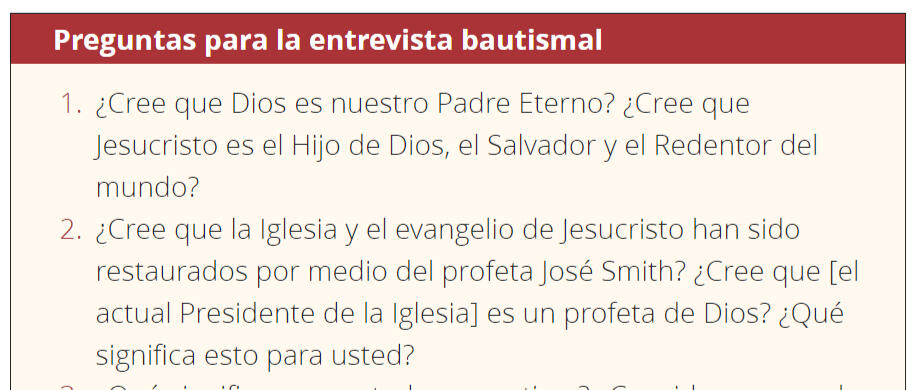 1. ¿Tiene fe en Dios el Eterno Padre, en Su Hijo Jesucristo y en el Espíritu Santo, y tiene un testimonio de Ellos?2. ¿Tiene un testimonio de la expiación de Jesucristo y de la función que Él tiene como su Salvador y Redentor?3. ¿Tiene un testimonio de la restauración del evangelio de Jesucristo?4. ¿Apoya al Presidente de La Iglesia de Jesucristo de los Santos de los Últimos Días como el profeta, vidente y revelador; y lo reconoce como la única persona sobre la tierra autorizada para ejercer todas la llaves del sacerdocio?¿Apoya a los miembros de la Primera Presidencia y del Cuórum de los Doce Apóstoles como profetas, videntes y reveladores?¿Apoya a las demás Autoridades Generales y a los líderes locales de la Iglesia?5. El Señor ha dicho que se hagan todas las cosas “con pureza” ante Él (Doctrina y Convenios 42:41).¿Se esfuerza para que sus pensamientos y su comportamiento sean moralmente limpios?¿Cumple con la ley de castidad?6. ¿Sigue usted las enseñanzas de la Iglesia de Jesucristo en su comportamiento para con los miembros de su familia y otras personas tanto en privado como en público?7. ¿Apoya o promueve enseñanzas, prácticas o doctrinas que sean contrarias a las de La Iglesia de Jesucristo de los Santos de los Últimos Días?8. ¿Se esfuerza por santificar el día de reposo tanto en su casa como en la Iglesia, asistir a las reuniones, prepararse para participar dignamente de la Santa Cena y vivir en armonía con las leyes y los mandamientos del Evangelio?9. ¿Se esfuerza por ser honrado en todo lo que hace?10. ¿Paga un diezmo íntegro?Para nuevos miembros que solicitan una recomendación de uso limitado: ¿Está dispuesto a obedecer el mandamiento de pagar los diezmos?11. ¿Entiende la Palabra de Sabiduría y la obedece?12. (Esta pregunta se omite cuando se entrevista a un niño o joven). ¿Tiene obligaciones financieras o de otra clase con un excónyuge o con hijos?Si las tiene, ¿está al día con esas obligaciones?13. (Se omite esta pregunta al entrevistar a un miembro que no ha recibido la investidura). ¿Cumple con los convenios que hizo en el templo?14. (Se omite esta pregunta al entrevistar a un miembro que no esté investido). ¿Honra su sagrado privilegio de usar el gárment como se indica en las ordenanzas iniciatorias? (Lea a cada miembro la declaración “El uso del gárment del templo”, que se incluye más abajo y luego prosiga con las preguntas).15. ¿Existen pecados en su vida que se deban resolver con las autoridades del sacerdocio como parte de su arrepentimiento?16. ¿Se considera digno de entrar en la Casa del Señor y participar en las ordenanzas del templo?El uso del gárment del temploEl gárment del santo sacerdocio nos recuerda el velo del templo, y ese velo simboliza a Jesucristo. Cuando lleva puesto el gárment, lleva un símbolo sagrado de Jesucristo. El llevarlo puesto es una expresión exterior de su compromiso interior de seguirlo a Él. El gárment también es un recordatorio de sus convenios del templo. Debe llevar puesto el gárment día y noche a lo largo de su vida. Cuando se lo deba quitar para realizar actividades que por lógica no se puedan llevar a cabo con el gárment puesto, procure volver a ponérselo lo antes posible. Al guardar sus convenios, incluso el sagrado privilegio de llevar el gárment como se indica en las ordenanzas iniciatorias, tendrá mayor acceso a la misericordia, la protección, la fortaleza y el poder del Salvador.