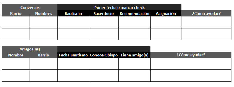 3) invitarle a experimentar en el Evangelio (Ej. Leer el Libro de Mormón; recibir a los misioneros; conocer la iglesia, el templo o su hogar; hacer convenios sagrados, etc.).Cada mes se compartirán experiencias y se extenderá/renovará el desafío en nuestro Consejo de Estaca.b) Se establece un seguimiento y coordinación mensual: Misión > Estaca > Barrio1. Comunión con los Líderes de Zona y el Presidente de MisiónAdemás de deliberar junto al presidente, los líderes de zona nos traen lista de amigos bautizados en las cuatro últimas semanas, y lista de amigos con fecha bautismal para alguna de las 4 semanas siguientes, con el fin de conocer la visión de los misioneros respecto a ellos.2. Sinergia con los barriosSe llevará a cabo un Breve Encuentro Mensual de Estaca, dirigido por el miembro del sumo consejo asignado a la obra de compartir el evangelio, asistiendo los líderes misionales o un líder asignado dentro de la Presidencia del Quórum de Élderes de cada barrio, con el objeto de conocer el progreso de los hermanos bautizados y cercanos a bautizarse, según su compromiso de fecha, ofreciendo apoyo al líder en el barrio, respecto de los hermanos con fecha bautismal futura. Como referencia se usarán algunas tablas (ver aquí).Se realizará el día 28 de cada mes, o a la brevedad esa misma semana antes de terminar el mes.c) Se establece un despliegue semanal de ayuda a los barriosMiembros del sumo consejo asignados a los barrios se valen de la información mensual del miembro del sumo consejo asignado a la obra de compartir el evangelio, para ofrecer más ayuda al barrio, semana a semana, respecto a los conversos recientes y amigos que progresan. Se examinará su progreso en nuestras reuniones de sumo consejo.
